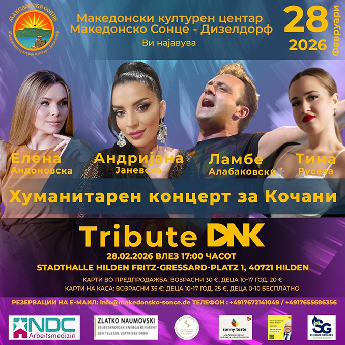 Der Zentralrat der Makedonen in Deutschland begrüßt und unterstützt mit tiefer Anteilnahme, großem Respekt und starker Verbundenheit die humanitäre Initiative unseres Partners, des makedonischen Kulturzentrums „Makedonsko Sonce“ Düsseldorf, zur Organisation des Benefizkonzerts „Kocani / Zu Ehren von DNK“, das am 28. Februar 2026 stattfinden wird.